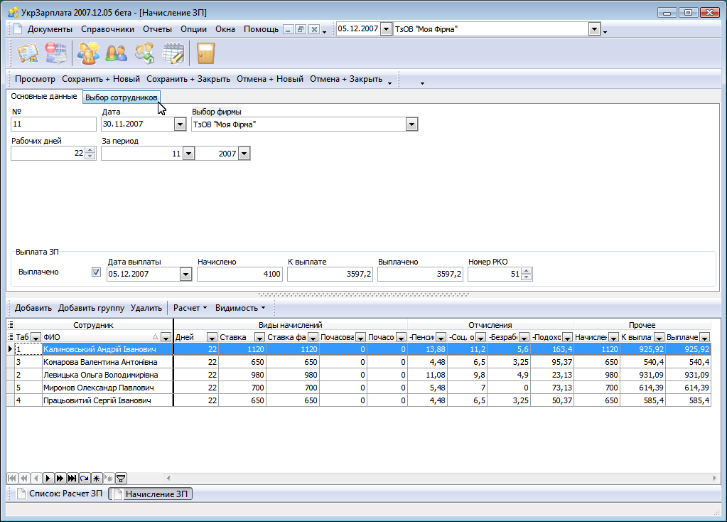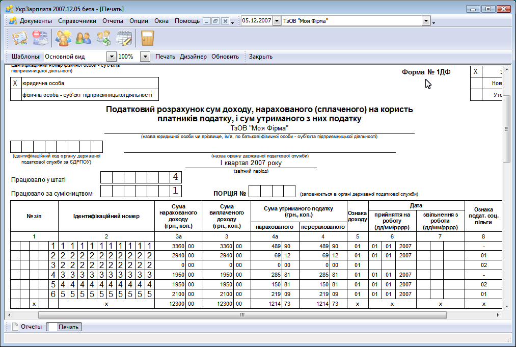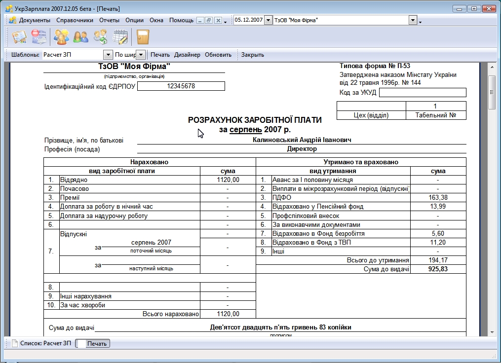 Одна з друкованих форм "Розрахунок заробітної плати"